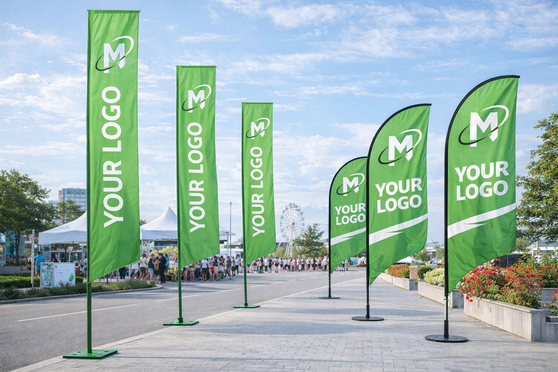 Sementara itu, flying banner memberikan kesan modern dan profesional. Media ini sering digunakan pada pameran, acara promosi, dan kegiatan kampanye luar ruangan. Dengan posisi yang strategis, flying banner mampu mengarahkan perhatian pengunjung langsung ke area yang diinginkan. Karena alasan tersebut, banyak brand memanfaatkan media ini sebagai penunjang utama promosi outdoor.