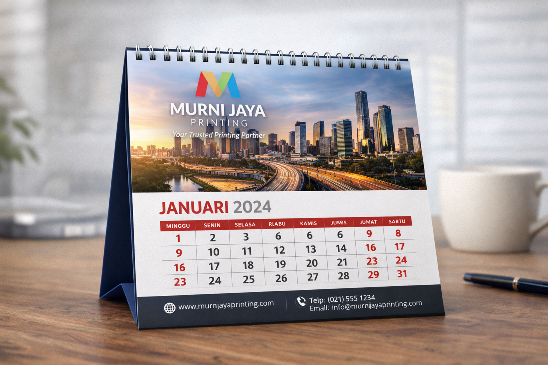 Desain profesional membuat kalender meja terlihat elegan dan cocok untuk meja kerja kantor maupun rumah. Kombinasi visual yang tepat menjadikan kalender sebagai dekorasi sekaligus media promosi.
