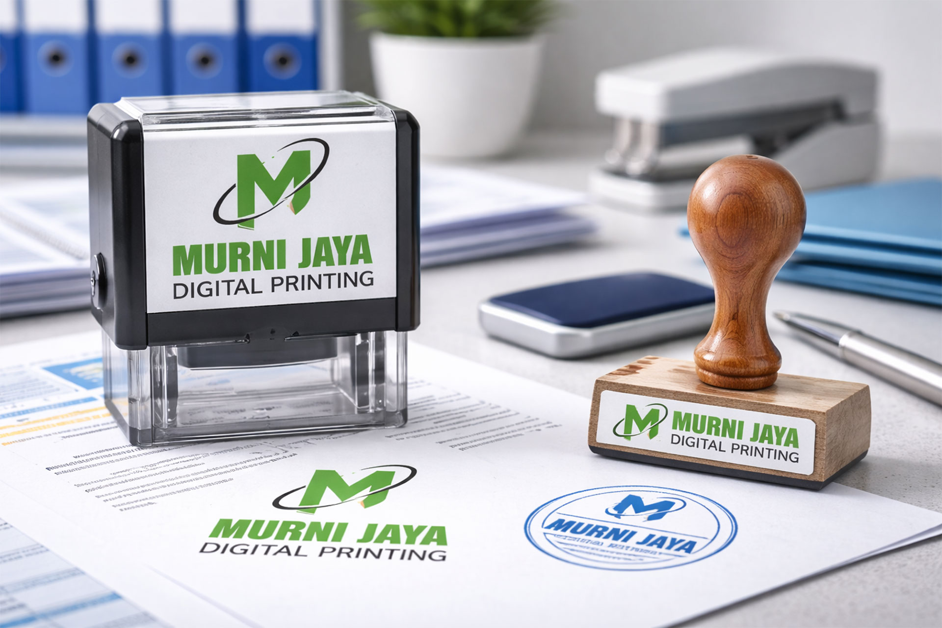 Murni Jaya Printing menyediakan layanan pembuatan stempel custom nama dan logo dengan hasil presisi dan tahan lama. Teknologi produksi modern memastikan detail desain tercetak dengan jelas. Selain itu, tersedia berbagai pilihan model stempel untuk kebutuhan bisnis dan administrasi.